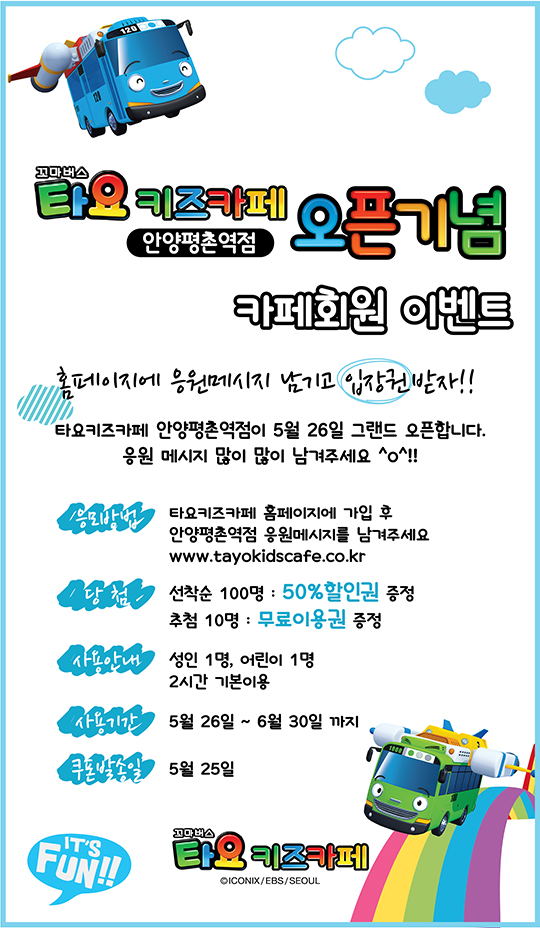 언제일까하고 계속 손꼽아 기다렸는데 드디어 내일이네요^^ 평촌살면서 근처 키즈카페 몇군ㄷ ㅔ있지만 어린아이가 좋아하는 타요가 생긴다니 더 반가워요 ~~ 자주 이용할께요~~꾸준히 오래 평촌에서 함께할수 있으면 좋겠습니다. 내일 아이가 어린이집 빠지게 되었는데 당장 내일가야겠군요 ^^!!!
