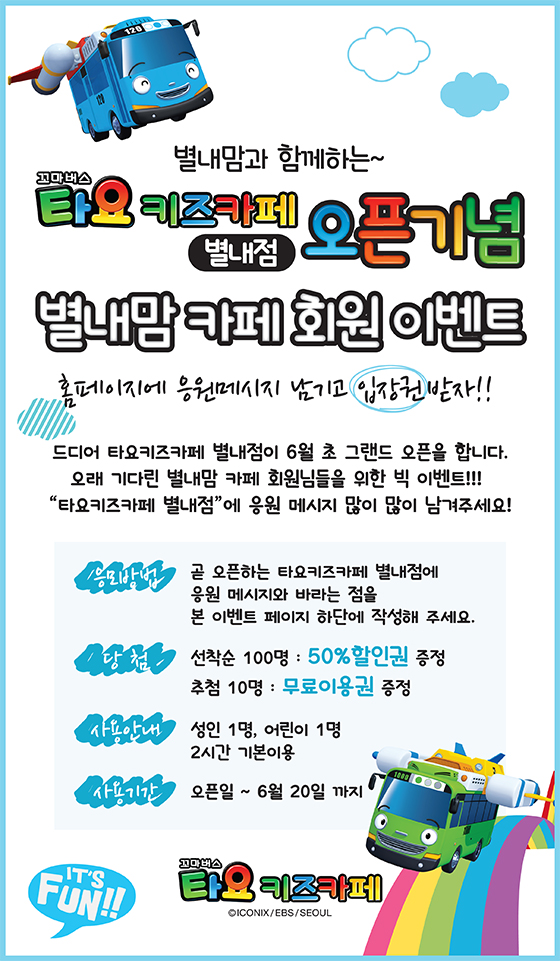 저희 딸이 타요를 엄청 좋아합니다. 서울에 지나가는 타요버스를 보면 소리지르면서 타요라고 손가락으로 가리키곤 합니다. 저희 집과는 거리가 좀 있지만 이번에 맘 먹고 우리 딸램을 위해 별내점을 가보려고 합니다. 타요 키즈카페가 앞으로 번창하길 기원하며 타요를 엄청 좋아하는 우리 딸램을 생각하며 오픈날 뵐께요~^^